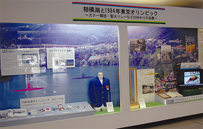 展示スペースには、当時、相模湖で行われたカヌー競技ゆかりの品々や実際に使用された聖火トーチのほか、東京五輪開催を記念して作られた絵はがきやメダル、ワッペンなどが並ぶ。