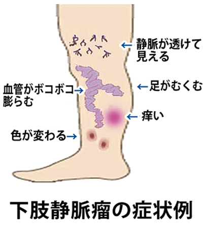 肢の静脈の血流が逆流し、血管がボコボコと膨らみ腫れてきます。足が重い、だるい、つる、むくむなどの症状がおきます。