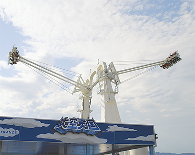 オープンする「大空天国」は、2台の16人乗り大型ブランコ。最高速度80Km/hで地上からの最高角度115度まで交互に振り上げられ、大空に向かって投げられる爽快感と、遥か谷底へ振り落とされるような恐怖を繰り返し味わえる”爽快・絶叫”系のアトラクションだ。