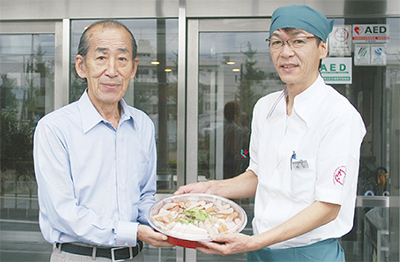養豚からハム、ソーセージなどの製造、販売を行っている(株)高座豚手造りハム相模原店(弥栄/梅宮政彦店長)が20日、特別養護老人ホーム「はあとぴあ」(清新/岩崎泉理事長)にオードブルセットを贈呈した。