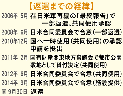 返還をめぐっては、2008年6月の日米合同委員会で返還が合意されたのを受け、10年から補給廠内の米軍住宅の移設など条件工事を国が開始。今年8月に完了したことから、9月18日からの同委員会で手続きが進められ、同30日に米軍が返還を了承した。今後は、現在所管する防衛省が土壌調査を行った上で財務省に移管。市と財務省との払い下げ交渉を経て市の所有となる。防衛省の調査は約2年を要する見通しだ。