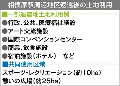 今回の返還は、相模原駅周辺の整備面でも大転換になる。市はすでに本年6月に基本計画を策定。返還地の跡地利用として、市の行政の中枢拠点、公的機関の集積のほか、国際会議を行えるコンベンションセンターやアート交流施設、宿泊、商業施設を挙げている。返還地と隣り合う約35haの共同使用区域では首都圏の防災拠点としての利用も検討されている。この基本計画を軸に、有識者らによる検討委員会が15年度まで具体化に向けた整備計画の策定を進める。市は、小田急多摩線の延伸、橋本駅付近のリニア中央新幹線神奈川新駅の設置、さがみ縦貫道を併せ、27年までに相模原、橋本駅周辺を一体とする広域交流拠点整備を加速させたい考え。将来的には、両駅の特性を生かした複眼都市を特色とする「さがみはら新都心」の実現を図る。