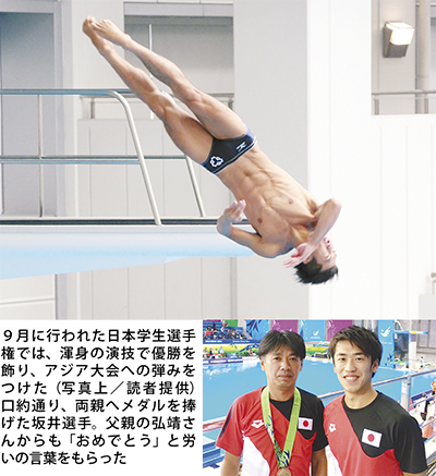 韓国・仁川で1カ月にわたり行われたアジア大会の男子3m板飛び込みで、相模原市出身の坂井丞さん(日本体育大学4年)が3位に入賞し、2度目の出場で初の銅メダルを獲得した。アジア大会の飛び込み競技において、日本人男子のメダル獲得は2大会ぶり。