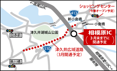 相模原ICの開通と同時に、市が主体となって整備を進めている津久井広域道路の一部も供用開始になる予定だ。同道路は、国道16号橋本五差路付近から国道20号中央道相模湖IC付近を結ぶ総延長約20Kmの幹線道路で、すでに吉野の勝瀬橋、二本松小学校付近から新小倉橋までの区間が完成。今回、新小倉橋から串川東地域センターまでの区間が供用開始になる。市道路整備課では「ICへの乗り入れが容易になり、各方面からのアクセス時間も短縮できる」と期待を寄せる。
