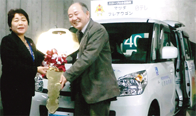 贈られたのは、昨年8月に日本テレビ系列で放映された「24時間テレビ『愛は地球を救う』」に寄せられた寄付金で購入したスロープ付きの軽自動車。車椅子に乗ったまま乗り降りすることができるため、同会の老人デイサービスセンターおやどりで2月から活用されている。これまで同センターには大型車両しかなく、道幅が狭いなどの道路事情によってはデイサービスの利用者の送迎が困難なケースがあった。今回寄贈を受けたことで支障をきたしていた方面も送迎が可能となったため、より多くの利用者を受け入れられるようになったという。