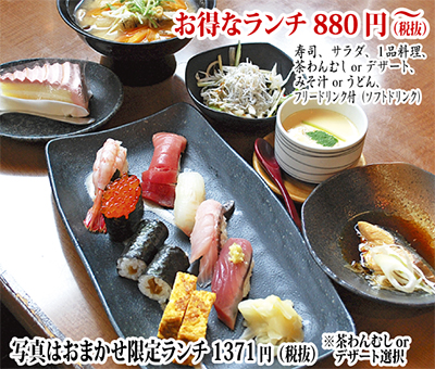 店内には座敷や個室が完備されており、法事や宴会、記念日など、様々なシーンで活用できる。オープンから休憩無しで営業のため、お昼時間に食べそびれた人や、ママ友のランチ会にもオススメ。宴会は昼からOKでコース(3500円〜)も充実。寿司に加え、焼物・揚物などの一品料理も豊富。ぜひ行ってみては。