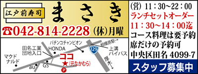 6月のOPEN以降、「寿司職人が握る回らないお寿司が気軽に味わえる」と評判なのが田名(なかむら跡)の江戸前寿司まさき。関処相生店の責任者で「まーくん」の愛称で親しまれた高橋正樹さんが開業。寿司職人が握る鮮度抜群のネタをお手頃価格で楽しめる。