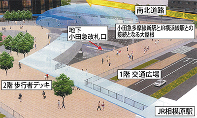 JR相模原駅と橋本駅周辺を一体的に整備し、広域交流拠点「さがみはら新都心」の形成をめざす市は7日、両駅周辺の整備イメージ図を公表した。このうちJR相模原駅北口については、2階部分に歩行者デッキ、1階部分に交通広場、地下には小田急多摩線の延伸を実現して新駅の設置を想定。同駅の改札口を設けることなどを検討している。
