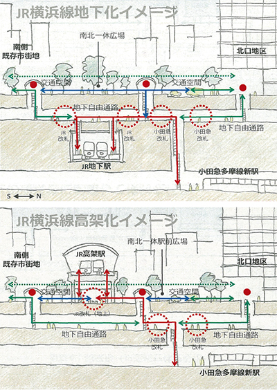 そのため市が示した同駅北口のイメージ図においても、小田急多摩線新駅を降りて、地下から地上へ上がると交通広場やデッキにつながるなど、「まち」への歩行者誘導を意識している。