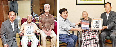 現在107歳の中村スヾさんと、103歳の班目加納さんの自宅を訪れた市長は「ご長寿おめでとうございます」と書かれた直筆の色紙などを手渡し、「いつまでもお元気で過ごしてください」などと声を掛けた。
