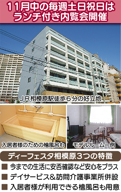 相模原駅南口徒歩6分の好立地に、今人気のサービス付き高齢者向け住宅「ディーフェスタ相模原」が12月誕生する。10月31日(土)から11月3日(火)はランチ付き内覧会を開催。施設内をゆっくりと見学するまたとないチャンスだ。
