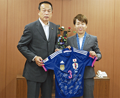 当日は、岩清水選手が加山俊夫市長のもとを訪れ、ワールドカップでの準優勝と、所属する日テレ・ベレーザでの昨年度の皇后杯優勝を報告。加山市長からは表彰状などが手渡され、岩清水選手からは「なでしこジャパン」全員のサイン入りユニホームが市へ寄贈された。寄贈されたユニホームは市役所本館一階のロビーに展示される予定。