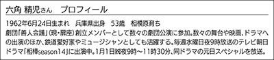 兵庫県出身の六角さんは、小学1年生の頃、父親の転勤の都合により相模原市に移り住んだ。小さい頃は辺りを自転車で駆け回るような活発な少年であったといい、「実家の東林間のまわりはその頃、野原や森が多くて、遊ぶところには困らなかった。番田や下溝あたりを通って、よく自転車で相模川に『探検』しに行ってましたよ」。そんな多感な少年時代を経て厚木高校に進学した六角さんは、「楽そうな部活だったから」と演劇部に入部。「特に俳優を志していたわけではなかったんです。すぐに辞めようと思っていましたから」。だが、そこで転機となる出会いを果たす。同じ部活の一学年上に、現在、演出家・劇作家として活躍する横内謙介さんがいたのだ。卒業後はその横内さんに誘われる形で、劇団「善人会議」の旗揚げに参加。こうして、演技者の道へと一歩を踏み出した。