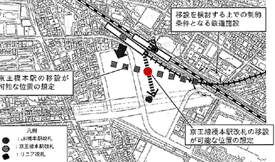 現在のJR・京王線橋本駅改札と、計画中のリニア改札は距離が離れている。JR線駅改札とは250m超、京王線駅改札とは300m超の距離があり、高低差も約30mある。現状のままでは在来線とリニア駅との乗換えが不便であり、まちの賑わいも分散してしまうと懸念されていた。そこで京王線駅改札口を、市がまちづくりの中心として構想する「交流・賑わいの軸」上に移設することで、最も人通りの多いJR線と京王線の間の通路を「交流・賑わいの軸」と一致させることができ、リニア改札への乗換え利便性の向上に加え、賑わいの創出も図ることができるとしている。