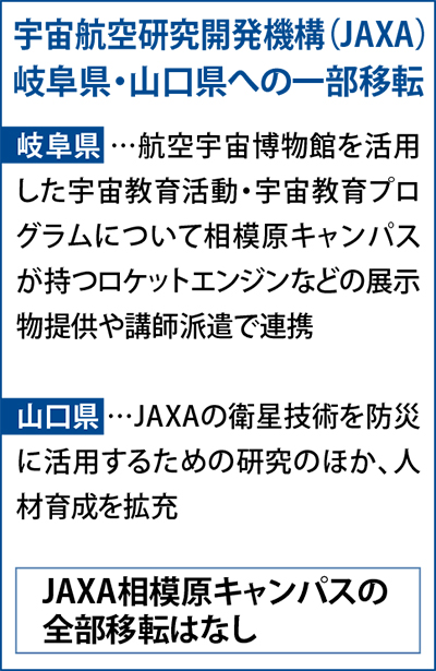 創生本部が発表した基本方針によると、JAXAは岐阜県と山口県への一部移転で連携。岐阜県では、各務原市が航空宇宙博物館などを活用して取り組む宇宙教育活動・宇宙教育プログラムへ、相模原キャンパスが持つロケットエンジンなどの展示物の提供や講師派遣を通じて連携、山口県では、JAXAの衛星技術を防災に活用するための研究のほか、人材育成について拡充を検討していく。両県とも、早期に連携協定を結ぶ考えを示している。