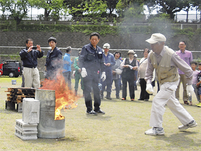 一方、鍋での米炊きや、ポンプを用いた放水訓練など、毎年新たな内容も取り入れている。訓練には、自治会員らを含む150人ほどが参加している。