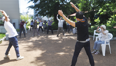 昨年4月から毎日続くこの活動は、ショートステイの利用者だけでなく一般の地域住民など様々な人が参加し、昔から慣れ親しんだラジオ体操に一丸となって取り組んでいる。「地域の多くの方々が健康のために、楽しみながらご参加していただいています。また、一般の方々と一緒に普段の生活リズムを大切にすることは、認知症の予防やケアにも役立つはず」と同施設の横井顕拠点長。「今後も継続して取り組んでいきたい」と話している。