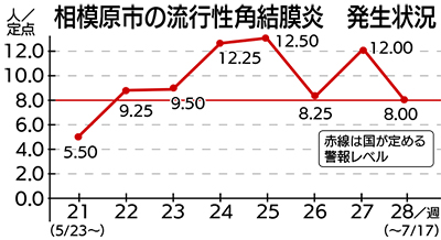 神奈川県衛生研究所の発表によると、市内での流行性角結膜炎の報告数は5月に入り増え始め、6月20日から26日の調査では定点あたりの患者報告数が12・50と今年最高値となった。これは国が定める警報レベル8・00を大幅に超えており、昨年同時期と比べて約8倍にあたる。7月11日から17日の調査では8・00に減少しているが、依然として警報レベルにある状況だ。市では、市内で流行している原因については把握をしていないと話している。