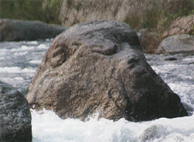 この写真は、青根にある緑の休暇村近くを流れる道志川にある岩を撮影したもの。天野さんは「お猿様が温泉に入っているような姿になって、ほっと一息ついているような顔に見えます。ぜひ見に来ていただき、青根地区が少しでも活気づいてくれれば良いですね」と話している。