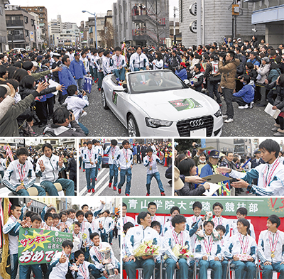 第93回箱根駅伝(東京箱根間往復大学駅伝競走/関東学生陸上競技連盟主催)で3連覇、今シーズンの大学駅伝3冠を果たした青山学院大学の健闘を称える祝賀パレードが1月29日、大野北地区まちづくり会議、にこにこ星ふちのべ商店会の主催で開催された。