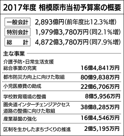 市はこのほど、2017年度の当初予算案を発表した。一般会計は前年度比12・3%増の2893億円で、過去最大の予算規模となった。子育て支援対策として、子育て家庭の保健・福祉に関する相談に一元的に対応する「子育て支援センター」を各区に設置するほか、広域交流拠点の形成や県道52号の整備等による都市づくりの分野に重きを置いた編成となっている。