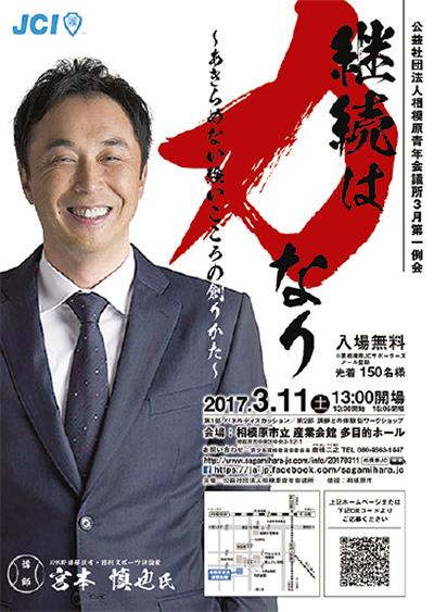 公益社団法人相模原青年会議所(相模原JC)は3月11日(土)、元プロ野球選手の宮本慎也氏を講師に迎えた講演会「継続は力なり〜あきらめない強いこころの創りかた〜」を開催する。会場は相模原市立産業会館で、午後1時開場、1時30分開始。参加は無料。