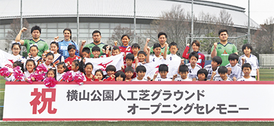 横山公園内に整備された人工芝グラウンドが1日から供用開始され、その3日前の3月29日にはホームタウンチームなども参加してオープニングセレモニーが行われた。