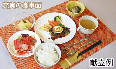 居室は完全個室。介護用ベッド、エアコン、テレビ、トイレ等のほか、露天風呂まで完備。食事は施設内の厨房の手作りで、素材の風味と栄養素を生かし、バランスの取れた料理を提供している。連休を利用した短期利用サービスも受付中。気軽に内覧会に申込みを。