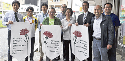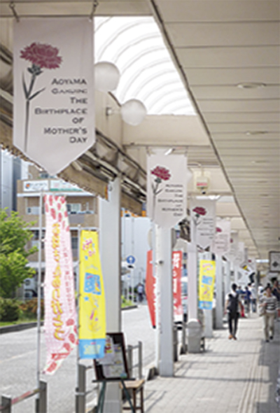 これはにこにこ星ふちのべ商店会と同駅周辺にキャンパスを構える青山学院大学の取組み。「母の日」が同大の女性宣教師の提唱に起源することから、日ごろ協力して街づくりに取組むにこにこ星ふちのべ商店会に同大とお揃いのフラッグを掲出することとなった。