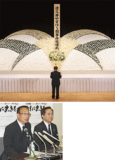 追悼式に参加したのは施設関係者や遺族をはじめ、行政関係者や一般の人671人。式は全員での1分間の黙とうなどの後に、追悼の辞へ。登壇したのは塩崎恭久厚生労働大臣、佐藤光神奈川県議会議長、沼倉孝太相模原市議会議長、津久井やまゆり園を運営する(社福)かながわ共同会の草光純二理事長、同園家族会「みどり会」の大月和真会長、同園の入倉かおる園長の6人。