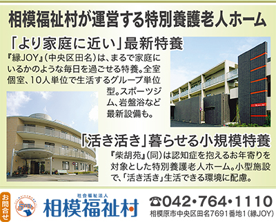 市内最大級の福祉グループ・社会福祉法人相模福祉村(赤間源太郎理事長)。同法人が運営する2つの特別養護老人ホーム「縁JOY」と「柴胡苑」では、入居者がその人らしく生活できる施設であるべく、一人ひとりに配慮した生活介護の場を提供している。