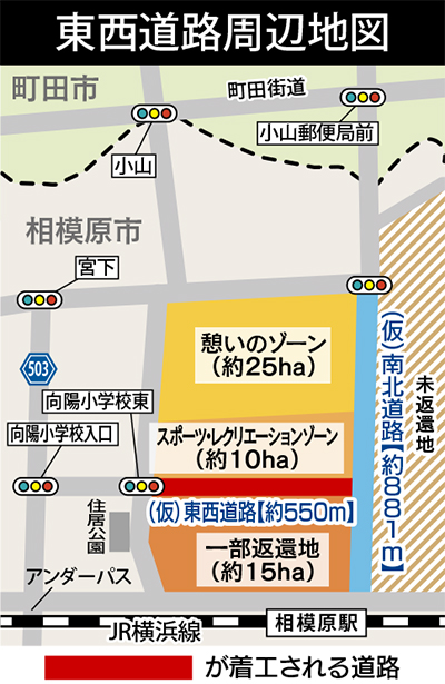 相模総合補給廠の一部返還地と共同使用区域の間を通過し、4月に開通した「南北道路」に接続する「東西道路」が8月中に着工する見通しとなった。完成すれば、市が取り組む相模原駅と橋本駅周辺を一体的に整備する広域交流拠点「さがみはら新都心」への周辺地域からのアクセス向上だけでなく、近隣道路の渋滞緩和などが期待できる。市は供用開始の時期に関して年度内を目標に、関係機関と調整を進めていく方針だ。