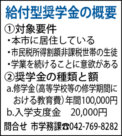 給付型奨学金は高校などでの授業料や教科書代などの教育費が対象。給付条件として、市内に居住していることに加え市民税所得割額非課税世帯の生徒であること、本人の学業への意欲があることが必要となる。