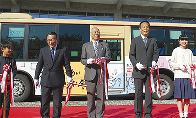 出発式にはほかにも、市障害児者福祉団体連絡協議会の鈴木秀美会長、沼倉孝太市議会議長らが出席。加藤さんのデザイがラッピングされたバスも初めて市民にお披露目された。加山市長は「素晴らしいデザインを提案して頂いた。バスを通じて障害への理解を深めて頂ければ」と話した。