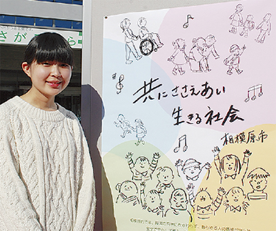 今年8月、市は障害に関する理解啓発のためのキャッチフレーズ「共にささえあい 生きる社会」を策定。これを周知させようと、イメージとなるデザインを広く公募し9点の応募があった。選出された女子美術大学3年の加藤乃梨佳さんは昨年、市内の特別支援学校を訪問した際に感じた、「人と人との関わりの大切さ」を表現したという。出発式の挨拶で加藤さんは、「デザインで使用している『♪=音楽』の広がりのように、この街にも互いに理解し合う心が広がっていけば」と話した。市障害政策課によると、運行するラッピングバスは2台で、来年の2月末まで市内を走行する他、加藤さんのデザイン画はポスターや横断幕などで啓発に使用していくという。