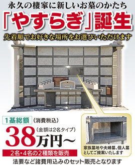 家族墓地や夫婦墓、さらには個人墓としても利用できるなど様々な家族形態に合わせた墓が、この集合墓「やすらぎ」だ。従来の独立タイプのお墓と違い、集合形式なのが特長。好きな場所を選べるなど自由度も高く、集合である分、安価で購入できるのも人気の理由だ。先着順で好きな場所を選べる。今回は法要など諸費用込みのセット販売となっている。