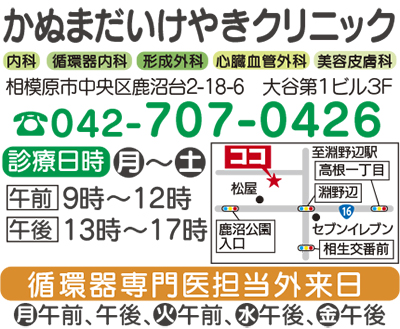 突然死の死者数は年間7万人ともいわれ、その原因の60%が心臓疾患とされる。同クリニックでは従来のクリニックの主な役割が生活習慣病の患者の診療とされる中で、大病院や大学病院から専門医を招致。循環器の専門医が担当する外来を設けることで高血圧症、糖尿病、脂質異常症など血管に悪影響を与える病気を総合的に管理している。外来は、レントゲン撮影、心電図検査、血管脈波検査、ホルター心電図検査、さらには専門医による心臓超音波検査の実施と評価など。来院予約等詳細は左記へ。