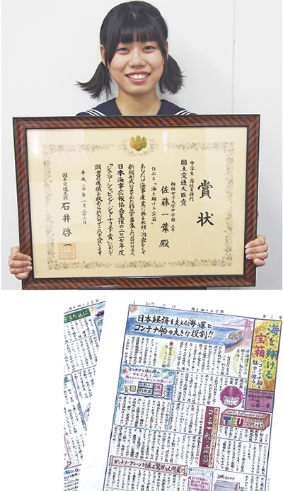 公益財団法人日本海事広報協会(伊藤松博理事長)が主催する「ジュニア・シッピング・ジャーナリスト賞」がこのほど発表され、市内在住の佐藤一葉さん(相模女子大学中学部3年)の新聞作品「海を翔ける宝箱」が1位に当たる国土交通大臣賞に輝いた。