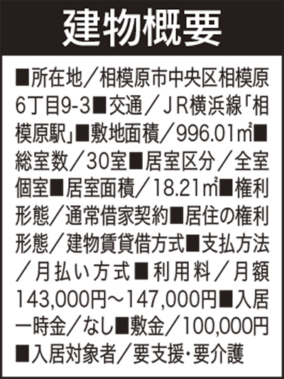 JR相模原駅から徒歩10分、相模原6丁目の住宅街に立地し、居室はサービス付き高齢者住宅の認定も受け18平方メートル(約11畳)。エアコン、照明、クローゼット、緊急ブザーの他にトイレ、洗面も設置されている。入居金0円で敷金10万円(退室時に精算)、月額料金は14・3万円から(家賃・水光、管理費込み)とかなり安価だ。