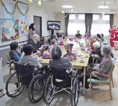 施設では毎日、午前は体操で午後は折り絵、カラオケなどのレクリエーションに加え、社交ダンスや手品のほか、ウクレレなどのボランティアによる演奏会も随時行われ、月2回は、音楽療法の音楽家も来訪する。