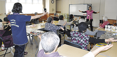 この取り組みはレクリエーション中の最後の10分間を職員の趣味を生かした試みにしようと3月から始めたもので、今回は利用者が楽しく健康に役立てる目的でフラダンスを実施した。利用者は動作のイメージについて職員から説明を受けた後、簡単な練習を挟んだ上で座ったままダンスを実践。職員のかけ声のもと、日本語訳されたハワイアン音楽に合わせてダンスを楽しんだ。職員の小島美香さんは「取り組む内容は毎日替え、職員も楽しんで臨めるように工夫しています。(フラダンスは)皆さんにも喜んでもらえてとてもよかった」と話す。