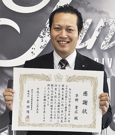 その後男性は逃走。女性は警察に通報し、同署は被害を防いだ功績を称え、草野さんを表彰した。草野さんは「2年前にも疑わしい人を乗せたことがあったので、警戒していた」と「お手柄」な一件を振り返った。