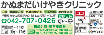 同クリニックではシワやシミなど加齢と共に増える肌の悩みへの治療(ヒアルロン酸、ボトックス注射など)から体表のしこりまで形成外科全般のセカンドオピニオンと北里大学病院への紹介を行う。