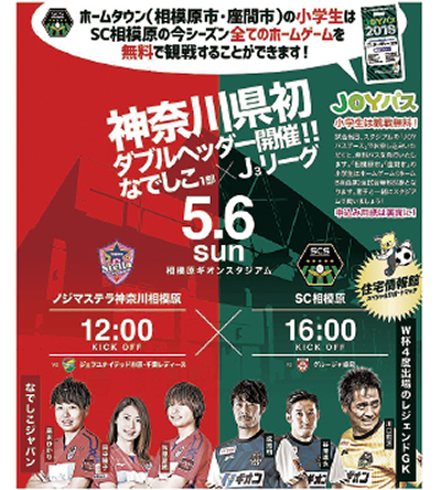 当日はSC相模原が小学生向けに発行している「JOYパス」を持っていれば、無料で両試合の観戦が可能。同パスは相模原市に加え近隣4市町村に在住、在学の小学生なら誰でも申し込みできる。中学生以上についてはSC対盛岡戦のチケットを購入することで2試合が観戦可能となる。