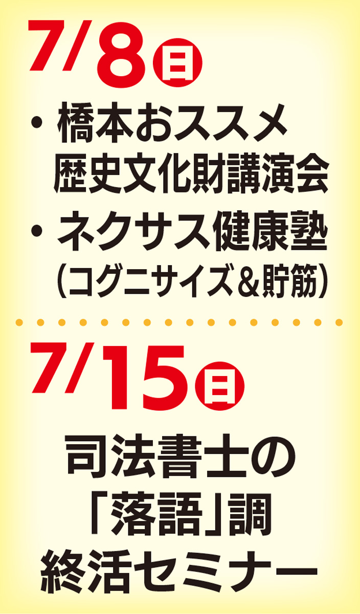 有料老人ホーム「ネクサスコート橋本」(緑区西橋本1の4の8)では定期的に地域向けイベントを企画。7月はまず、8日(日)に介護予防セミナー「ネクサス健康塾」(午後1時〜)と「橋本の歴史を知る会〜橋本おススメ歴史文化財講演会」(2時〜)が開かれる。また15日には司法書士「落語」調の終活セミナーも開催(午後1時30分〜)。