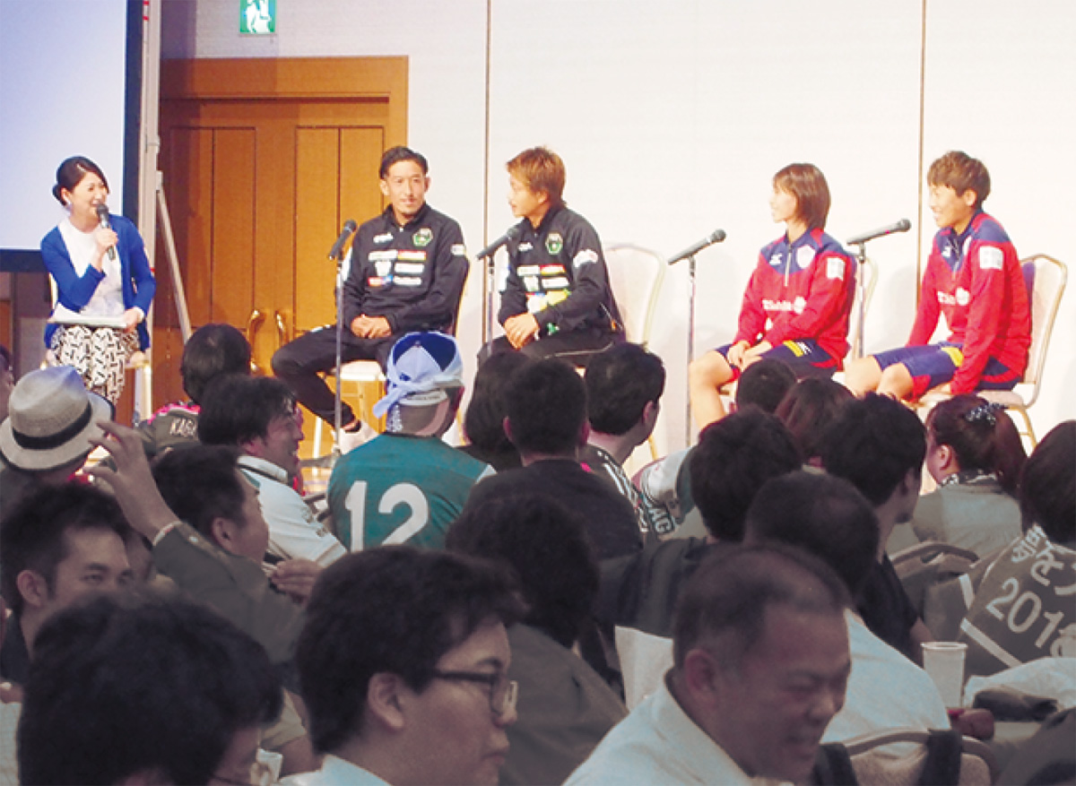 試合前には、地元サッカーチームSC相模原の谷澤達也選手、千明聖典選手、ノジマステラ神奈川相模原の高木ひかり選手、田中陽子選手によるトークショーも開催=写真。注目の選手や日本代表への期待などを語り会場を盛り上げた。
