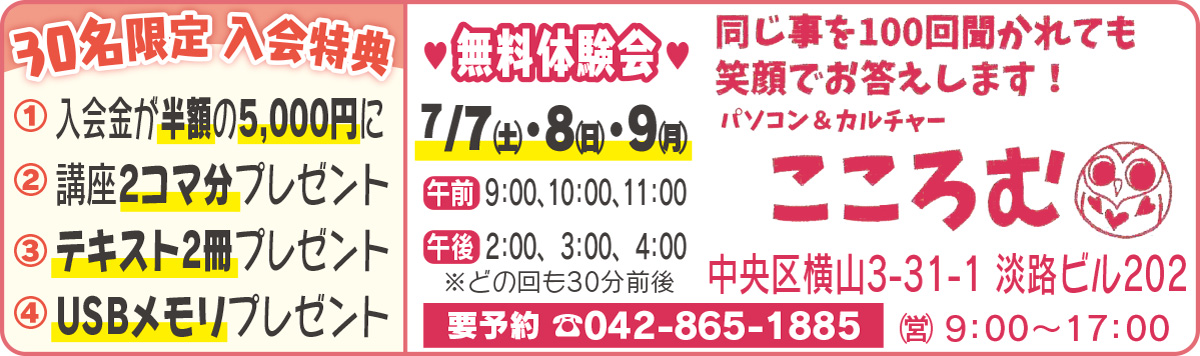 シニア向けパソコンと趣味の教室「パソコン&カルチャーこころむ」が7月11日(水)、市役所通りそばに開校する。