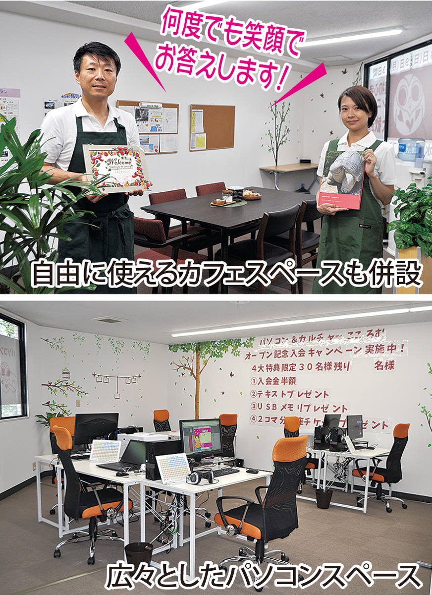 オープンに先駆け、7日(土)から3日間、無料体験会を実施。時間は下記の通りで、説明時間も込みで約30分。藤岡オーナーは「パソコンをはじめとした趣味を増やす機会にしてみませんか。まずは無料体験会にお越しください」と話す。