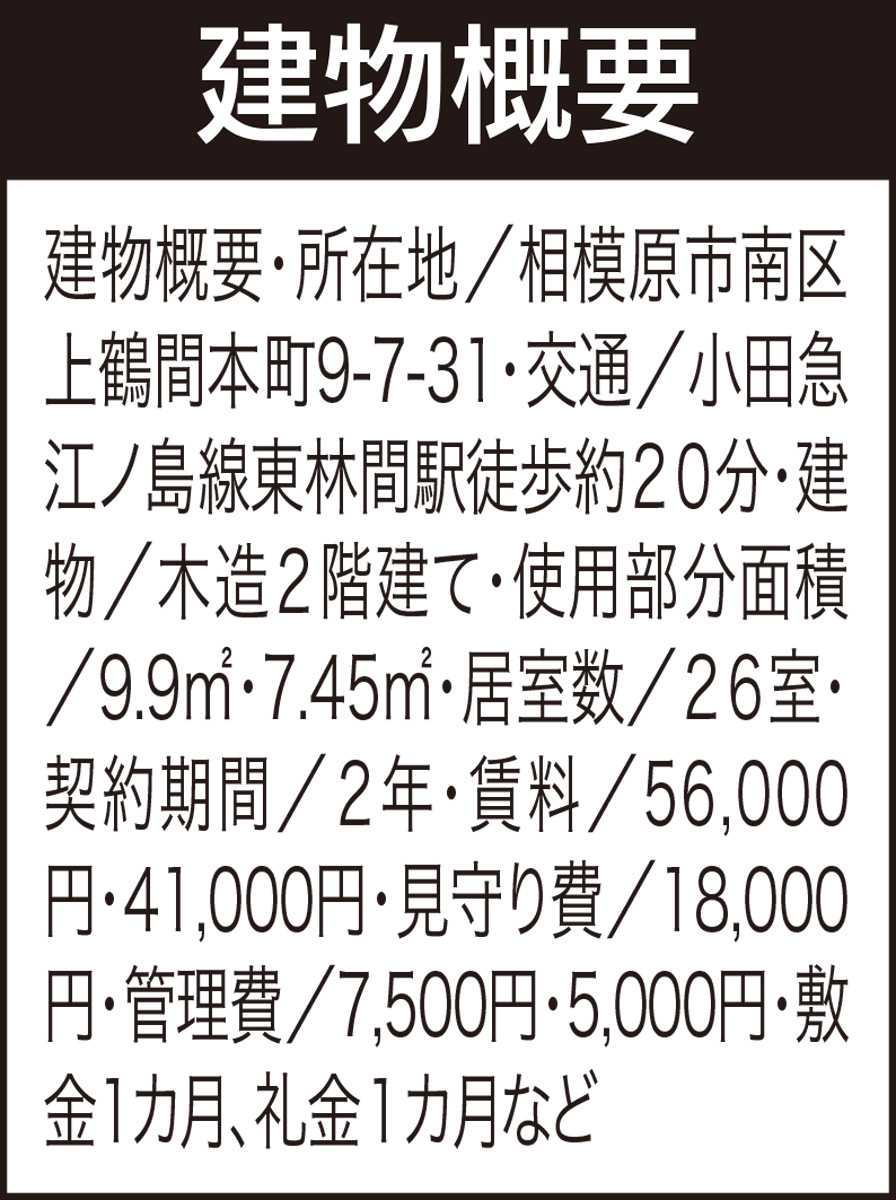 家賃は4・5畳4万1千円、6畳5万6千円。この他に管理費や見守り費が必要で、合計で各々6万4千円、8万1500円と安価。照明とエアコン、洗濯干し、スプリンクラー、自動火災報知機が設置されている。風呂やトイレは共用だ。