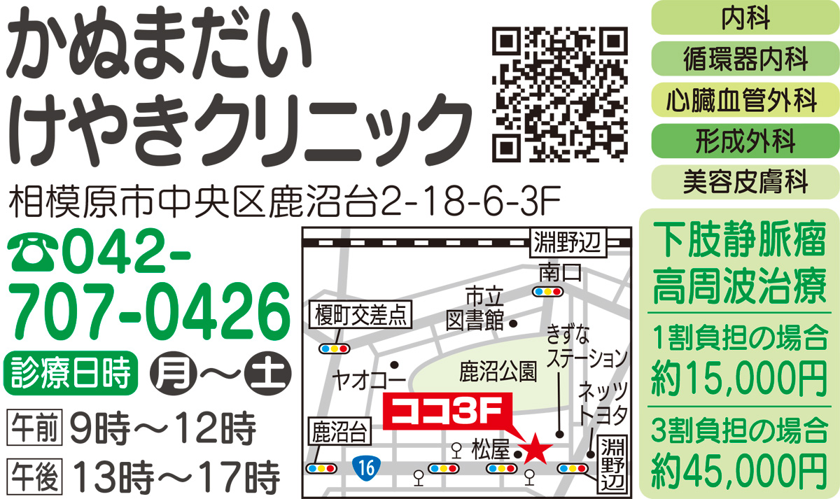 ”足のむくみ”に潜む疾患で、日本人の1割が潜在患者とも言われる「下肢静脈瘤」の早期発見・治療をめざすべく、『かぬまだいけやきクリニック』は今年4月から専門外来日を週3日に拡大している。美容師など、立ち仕事が多い専門職で働く女性の要望に応える。